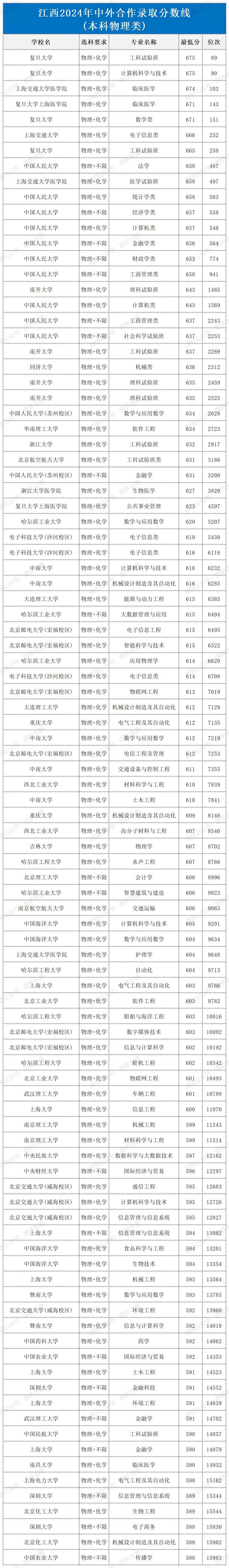 对于有意报考中外合作办学的学生而言,了解历年分数线走势、提前准备、提升综合素质至关重要。这些项目不仅考察学术能力,还关注学生的英语水平、国际视野以及跨文化交流能力。因此,考生需要在备考过程中全面提高自己,在激烈的竞争中脱颖而出。下面是江西2024年中外合作录取分数线,仅供参考。