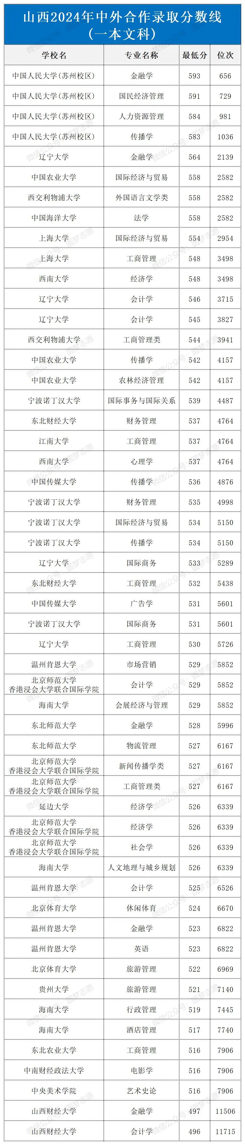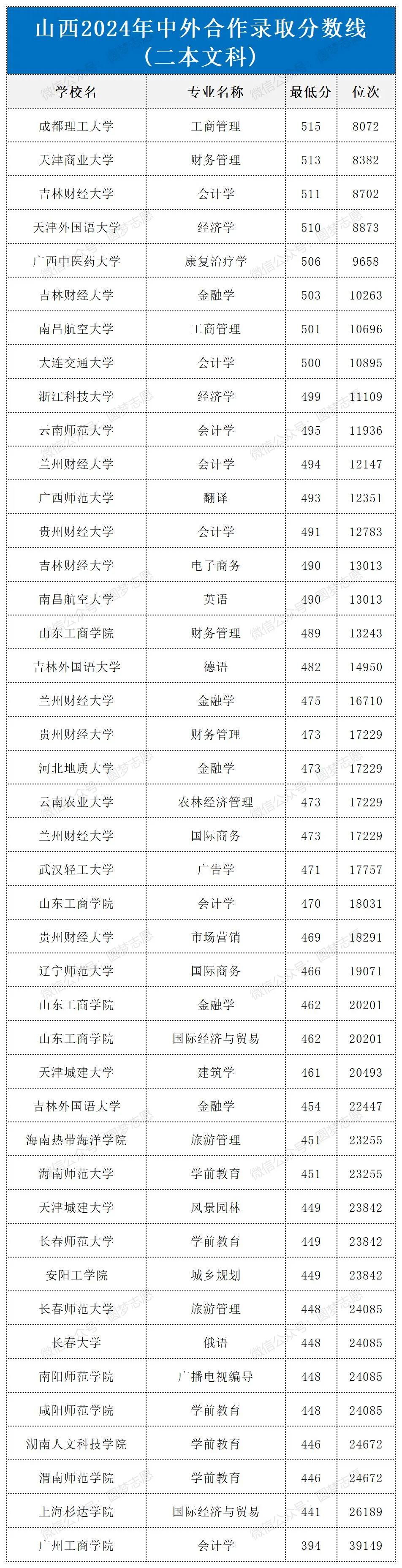 对于有意报考中外合作办学的学生而言,了解历年分数线走势、提前准备、提升综合素质至关重要。这些项目不仅考察学术能力,还关注学生的英语水平、国际视野以及跨文化交流能力。因此,考生需要在备考过程中全面提高自己,在激烈的竞争中脱颖而出。下面是山西2024年中外合作录取分数线,仅供参考。