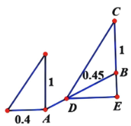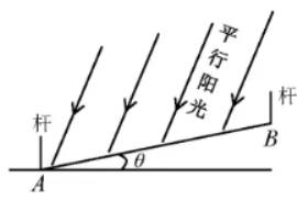 11.小申同学观察发现,生活中有些时候影子可以完全投射在斜面上.某斜面上有两根长为1米的垂直于水平面放置的杆子,与斜面的接触点分别为A、B,它们在阳光的照射下呈现出影子,阳光可视为平行光:其中一根杆子的影子在水平面上,长度为0.4米;另一根杆子的影子完全在斜面上,长度为0.45米.则斜面的底角