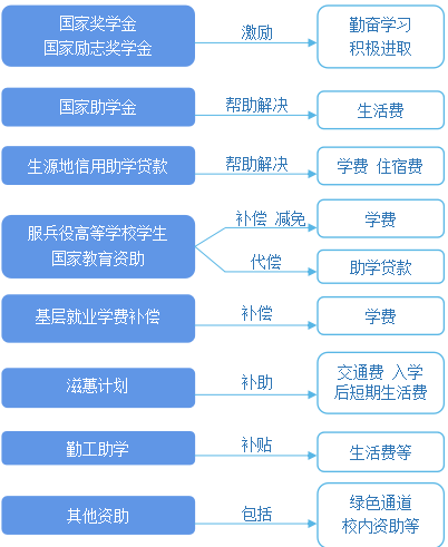 我省在高等教育本专科阶段建立起国家奖学金、国家励志奖学金、国家助学金、国家助学贷款等多种形式有机结合的高校学生资助政策体系。(如遇国家、省政策调整,以新政策文件为准执行)