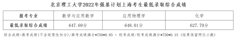 2022北京理工大学强基计划在北京数学与应用数学专业录取最低综合成绩是653分;2022北京理工大学强基计划在北京应用物理专业录取最低综合成绩是659.63分;2022北京理工大学强基计划在北京化学专业录取最低综合成绩是644.60分。