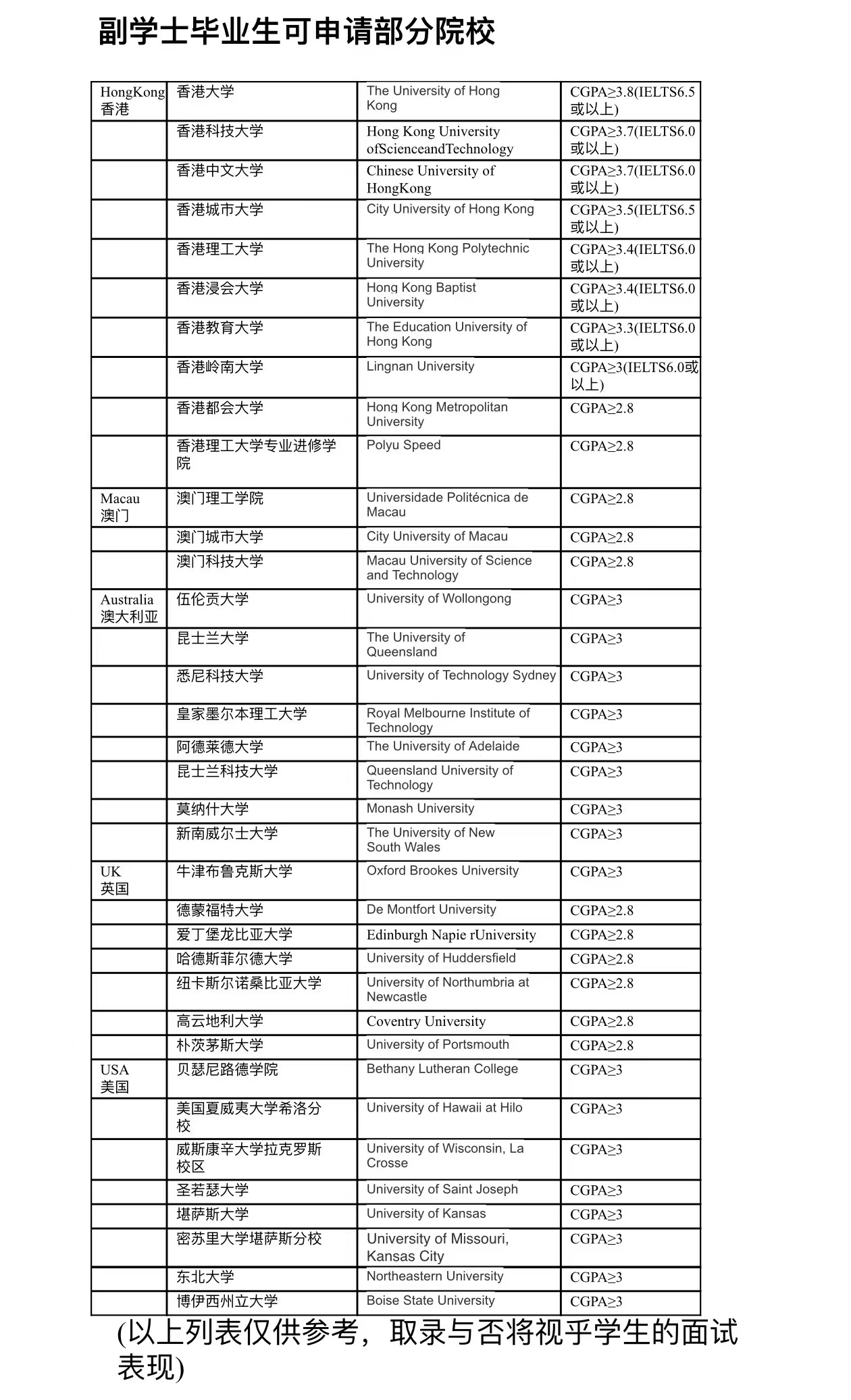 对接名校:学生在我院学习三年,成绩合格者按照专业课程GPA及雅思等语言成绩可申请港澳及海外名校学士及硕士;