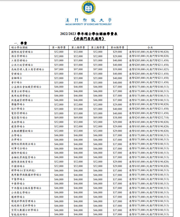 澳门科技大学研究生一年费用多少。澳门科技大学成立于2000年,是澳门特别行政区政府在澳门回归祖国之后批准创办的第一所国际化综合研究型大学。大学坐落澳门氹仔岛,现有11个学院学部,开设170多个专业课程。澳门科技大学硕士研究生一年费用情况如下表: