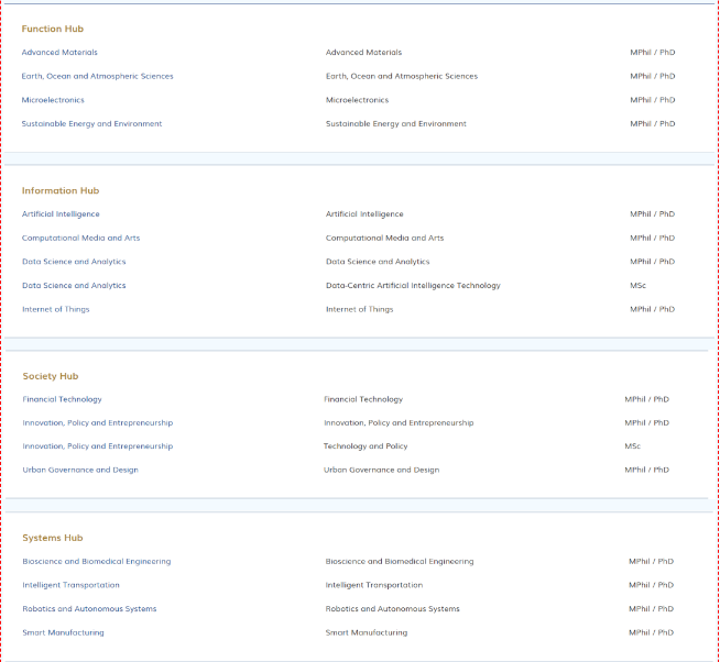 2024香港科技大学广州硕士研究生招生专业。申请专业,研究硕士&博士领域包含:先进材料、地球海洋和大气科学、微电子学、可持续能源及环境、人工智能、数据科学及分析、计算媒体及艺术、物联网、城市管理与设计、金融科技、智能交通、生物医学及生物医学工程、创新政策与创业、机器人和自主系统等。