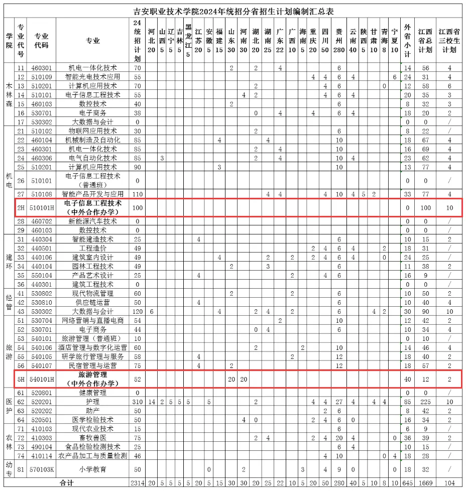 吉安职业技术学院中外合作办学专业有电子信息工程技术、旅游管理等,以下是具体名单一览表,供大家参考,由于专业设置可能会变动,正式填报时需要以学校最新公布的数据为准。