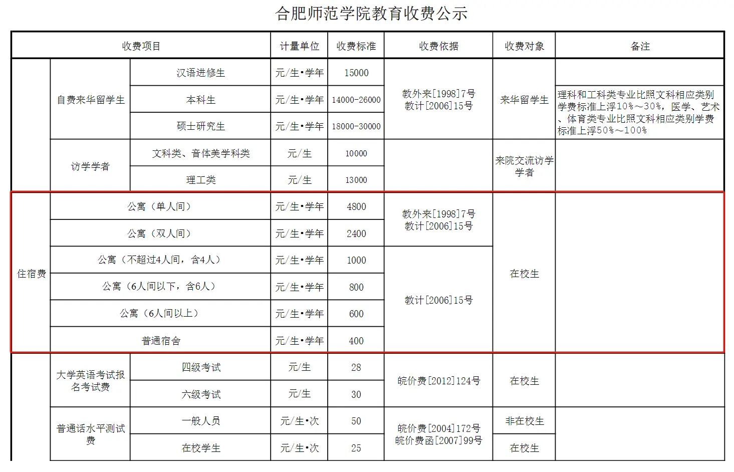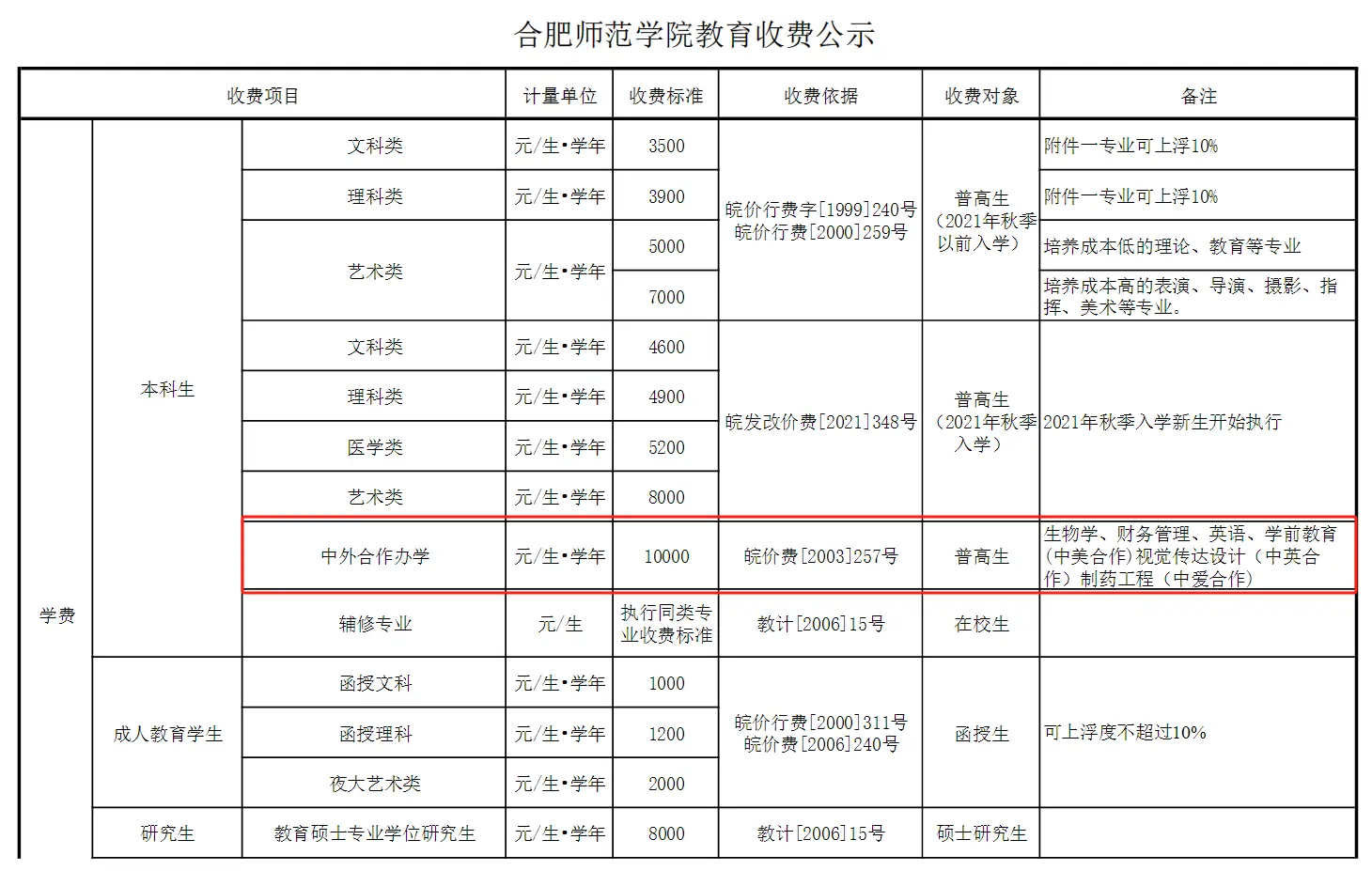 合肥师范学院中外合作办学学费:10000元/年;住宿费:普通宿舍400元/年,公寓600-4800元/年。以下为大家整理的是各专业收费标准,希望对大家有所帮助,如有变动,以学校最新公布的信息为准。